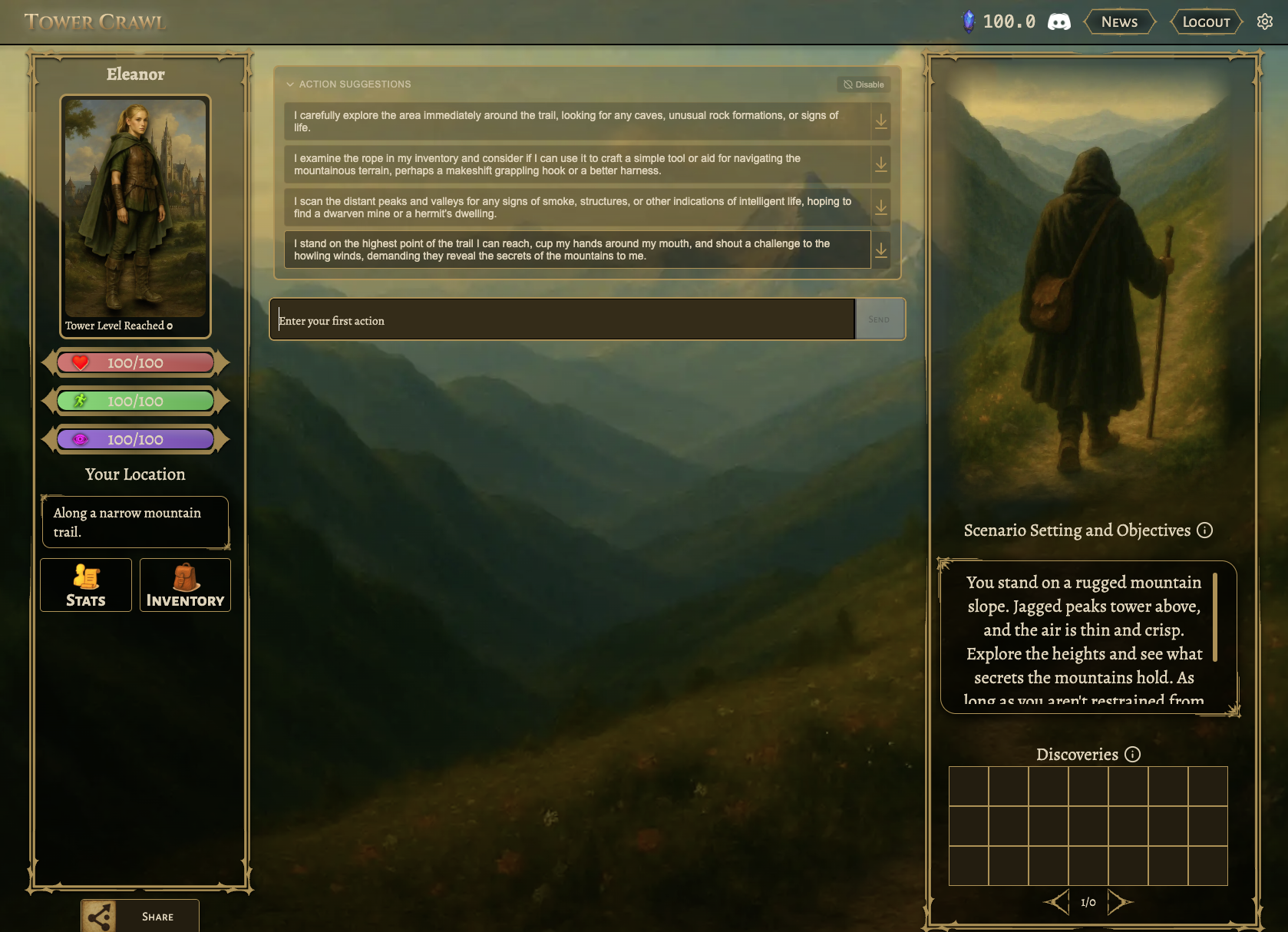 Tower crawl is a textual turn-based dungeon crawler featuring an LLM Dungeon Master that runs on our custom game engine.